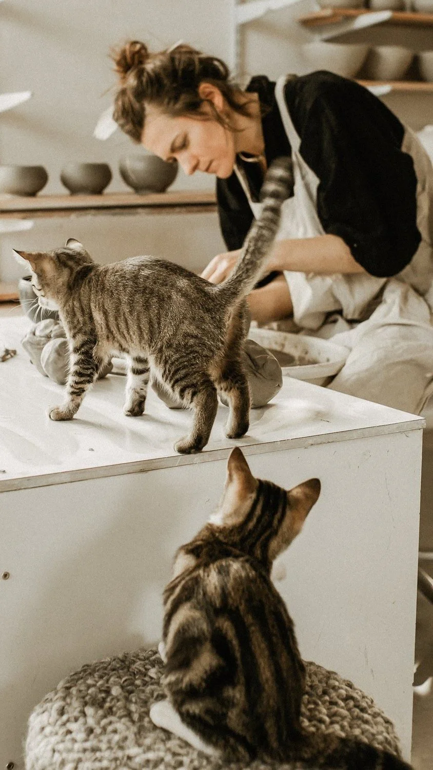 At Laima Ceramics, the creative experience extends beyond clay and glazes into the living landscape that surrounds the studio. Here, the rhythms of the making process are accompanied by the presence of horses in gentle horsemanship connection, curious studio cats, and the peaceful flow of nature — a combination that forms a truly niche and soulful creative environment.