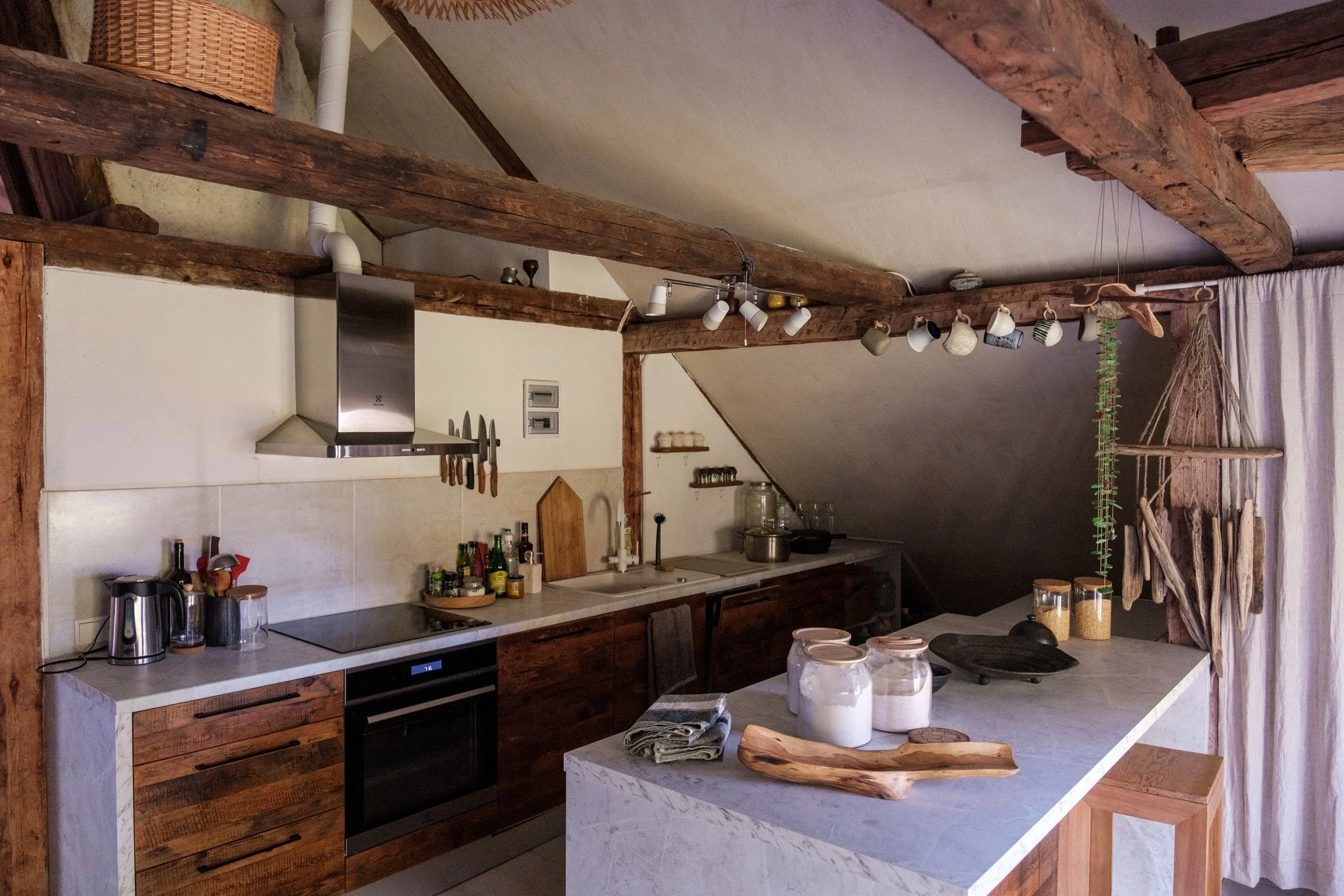 Upstairs shared space featuring a dining table, couch, and a shared bathroom. The main kitchen is fully equipped with an electric oven, induction cooker, kettle, hand blender, two fridges, coffee machine, toaster, juicer, as well as pots, pans, and plenty of handmade tableware.